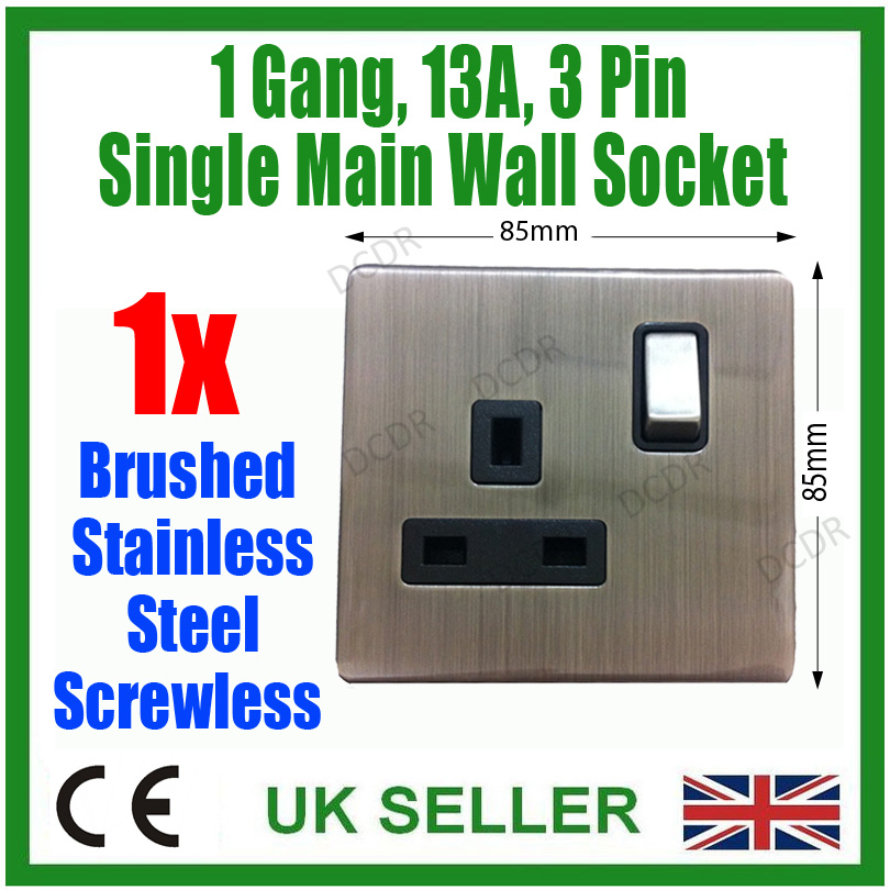 1x 1 Gang, Stainless Steel Screwless Single Mains Socket