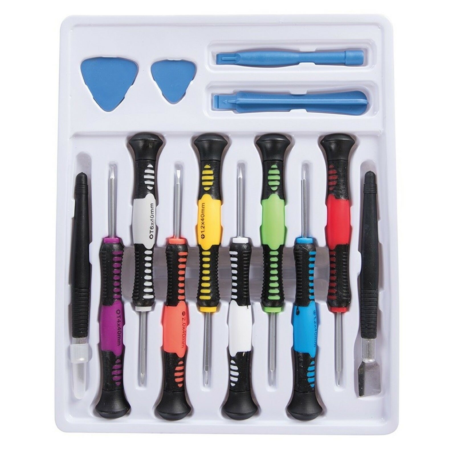 Slotted 2.0 x 40mm, Phillips 1.2 x 40mm, Trx T4 x 40mm, T6 x 40mm, & Pentalobe 0.8 x 40mm, 1.2 x 40mm